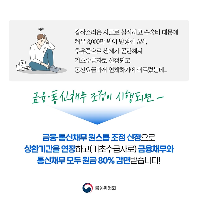 “갑작스러운 사고로 실직하고 수술비 때문에 채무 3,000만 원이 발생한 A씨, 후유증으로 생계가 곤란해져 기초수급자로 선정되고 통신요금마저 연체하기에 이르렀는데…”
