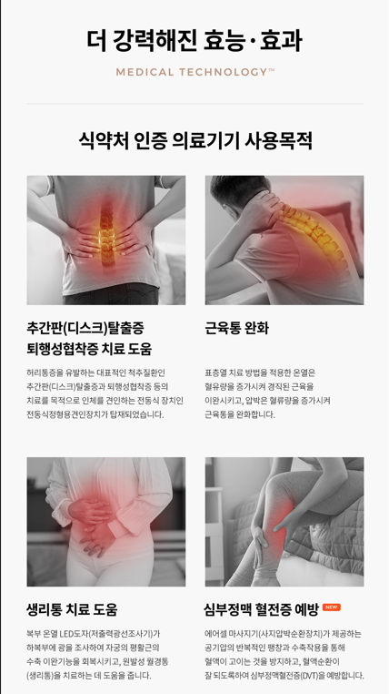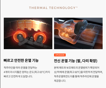 5세대 세라코어 엔진은 척추를 따라 온열 마사지를 제공함으로써 근육을 이완시킵니다. 이 기능은 척추 주변의 근육이 뭉치거나 경직된 경우에 특히 유용합니다. 온열 마사지가 혈류를 촉진시키고, 근육의 유연성을 회복시켜 통증을 완화하는 데 도움을 줍니다.