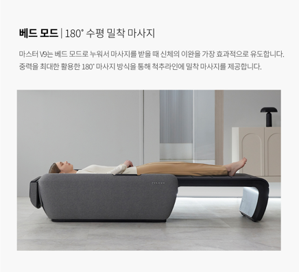 베드모드는 180도 수평으로 기기를 조정하여 누운 자세에서 마사지를 받을 수 있게 해줍니다. 이 모드는 중력을 최대한 활용하여 척추에 밀착된 마사지를 제공하며, 사용자의 몸이 자연스럽게 이완될 수 있도록 도와줍니다. 이는 특히 요통이나 디스크 탈출증으로 고통받는 사용자들에게 효과적입니다.
