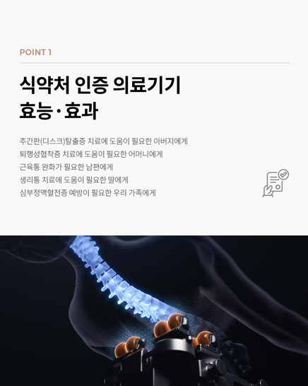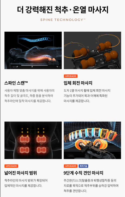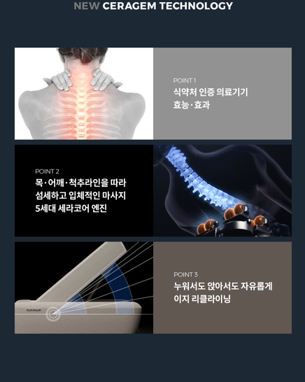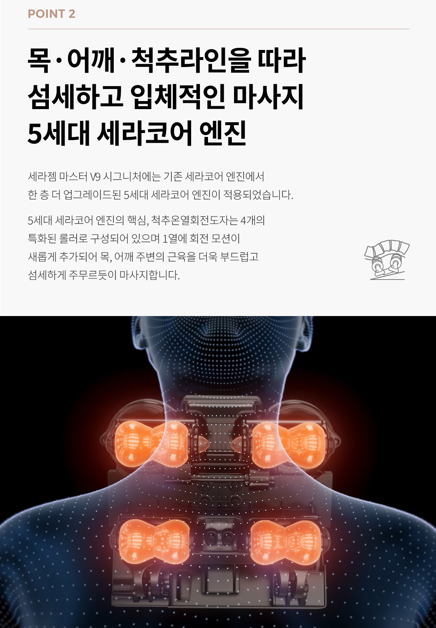 기존의 세라코어 엔진보다 한층 더 업그레이드된 5세대 엔진은 더욱 섬세하고 입체적인 마사지를 제공합니다. 이 엔진은 목, 어깨, 척추 주변의 근육을 효과적으로 자극하며, 특히 디스크 탈출증이나 척추 협착증 같은 척추 질환을 겪고 있는 사람들에게 큰 도움이 됩니다.
