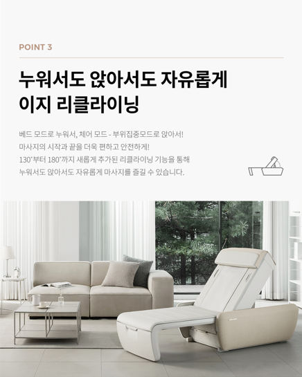 세라젬 마스터 V9는 누워서도 앉아서도 자유롭게 사용할 수 있는 리클라이닝 기능을 제공합니다. 이 기능은 사용자의 편안함을 최우선으로 고려한 설계로, 마사지 중에도 사용자가 원하는 각도를 자유롭게 조절할 수 있습니다.