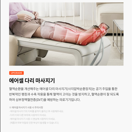심부정맥혈전증은 장시간 움직이지 않거나, 혈액 순환이 원활하지 않을 때 발생할 수 있는 위험한 질환입니다. 세라젬 마스터 V9는 정기적인 마사지를 통해 혈액 순환을 촉진시켜 이 질환을 예방할 수 있는 효과가 있습니다.