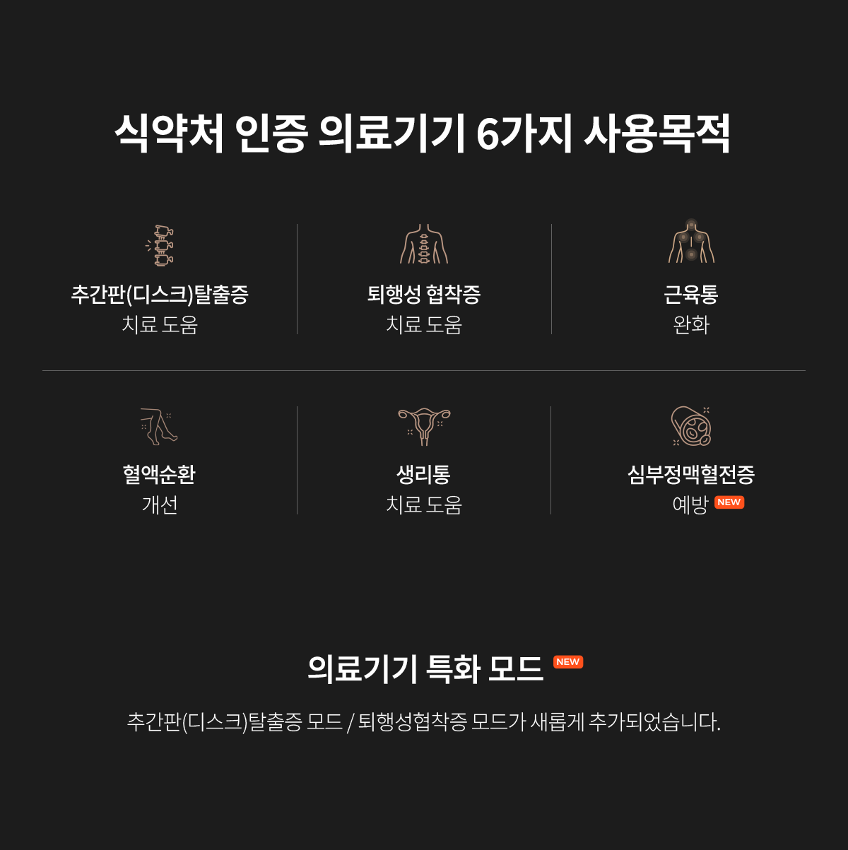 * **척추 견인 모드**: 추간판 탈출증 및 퇴행성 협착증 개선에 도움을 줍니다.