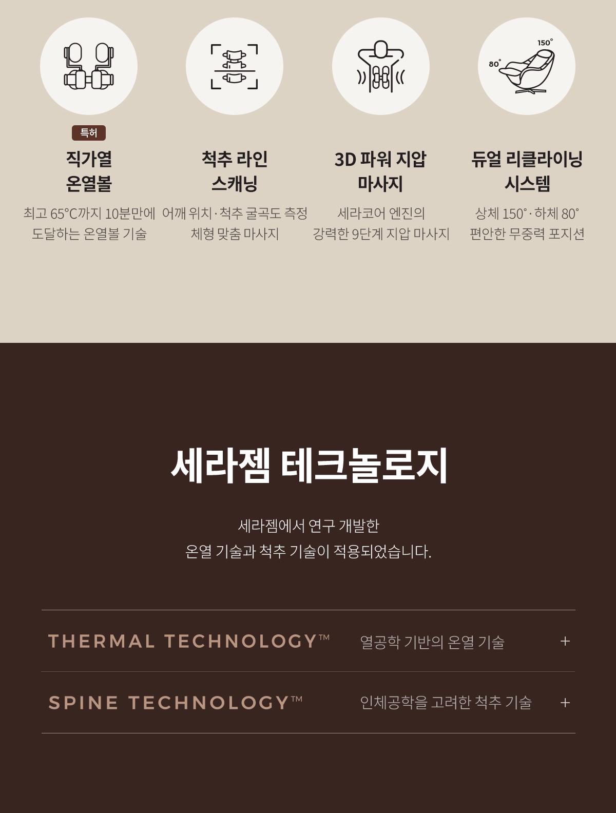 - 세라젬의 핵심 기술인 척추 스캐닝 및 온열 마사지 기능 탑재
