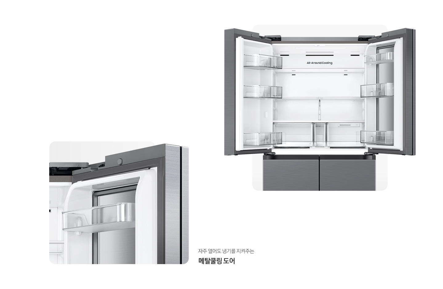 냉기를 지켜주는 메탈쿨링 도어는 냉장고 내부 온도 변화를 최소화하여 식재료를 신선하게 보관할 수 있도록 도와줍니다.
