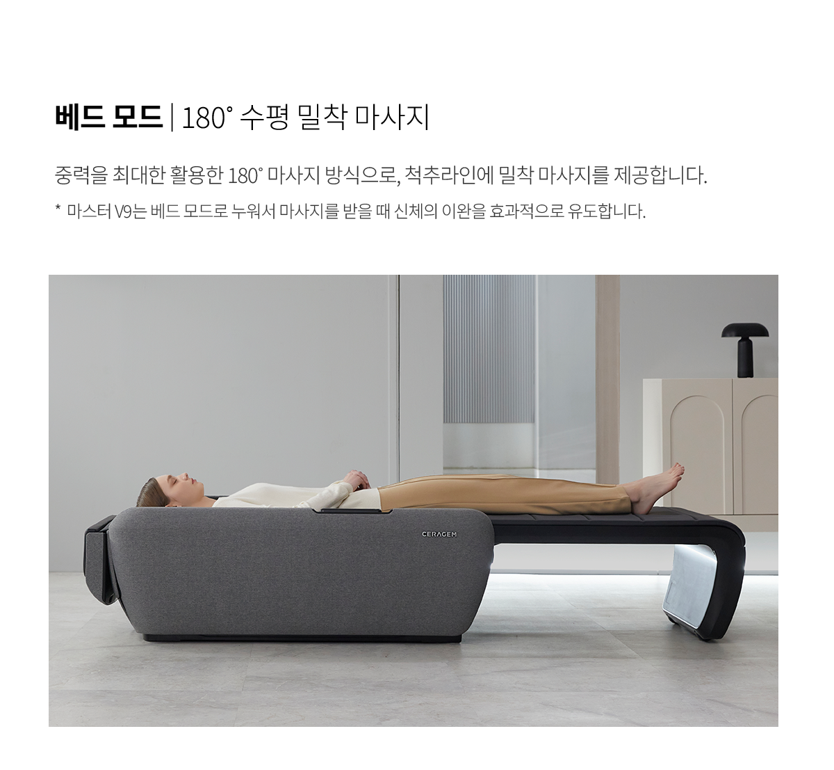 - 베드 모드: 180도 수평으로 누워서 마사지를 받을 수 있어 목에 부담을 주지 않고 편안하게 휴식을 취할 수 있습니다.