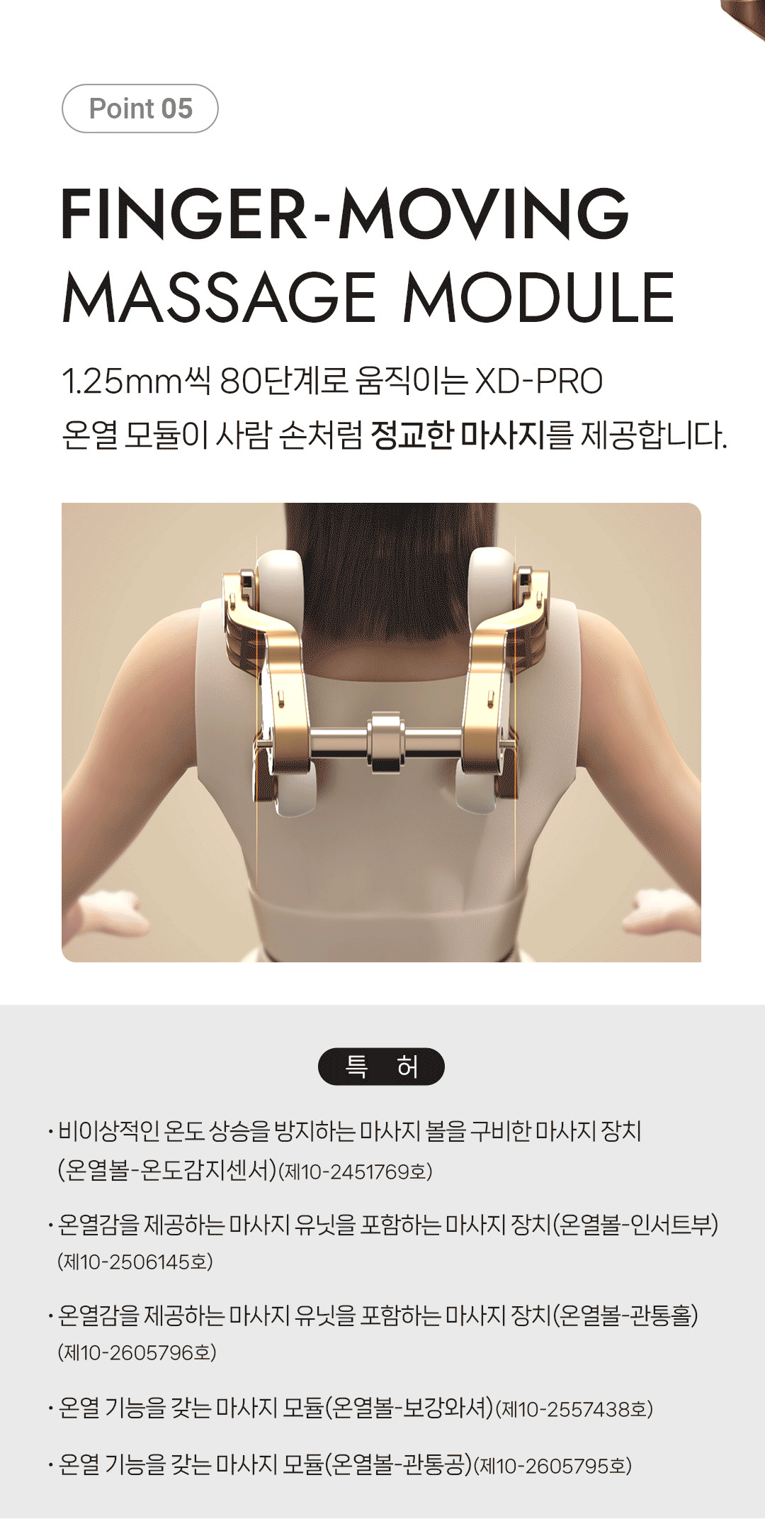팔콘SV는 XD 마사지 모듈을 통해 사용자에게 최적화된 마사지를 제공합니다. 마사지 강도는 5단계, 마사지볼 간격은 3단계로 조절 가능하며, 좌우 팔 마사지부에 탑재된 손지압 패드는 손의 피로를 효과적으로 풀어줍니다.