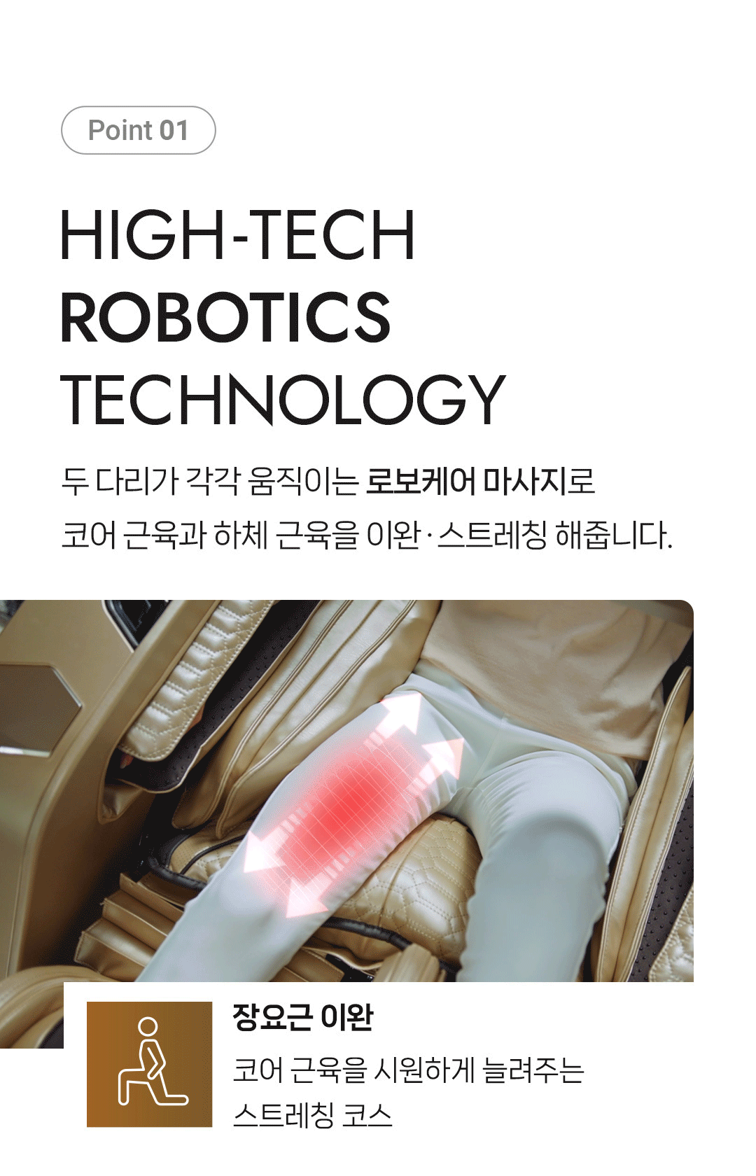 팔콘SV는 바디프랜드만의 독자적인 로보틱스 기술을 적용하여 더욱 진화된 마사지 경험을 제공합니다. 좌우 다리부가 독립적으로 구동되는 로보틱스 테크놀로지는 다리 가동 범위를 넓혀 스트레칭 효과를 극대화하고, 마사지 속도를 향상시켜 더욱 시원하고 효과적인 마사지를 선사합니다.