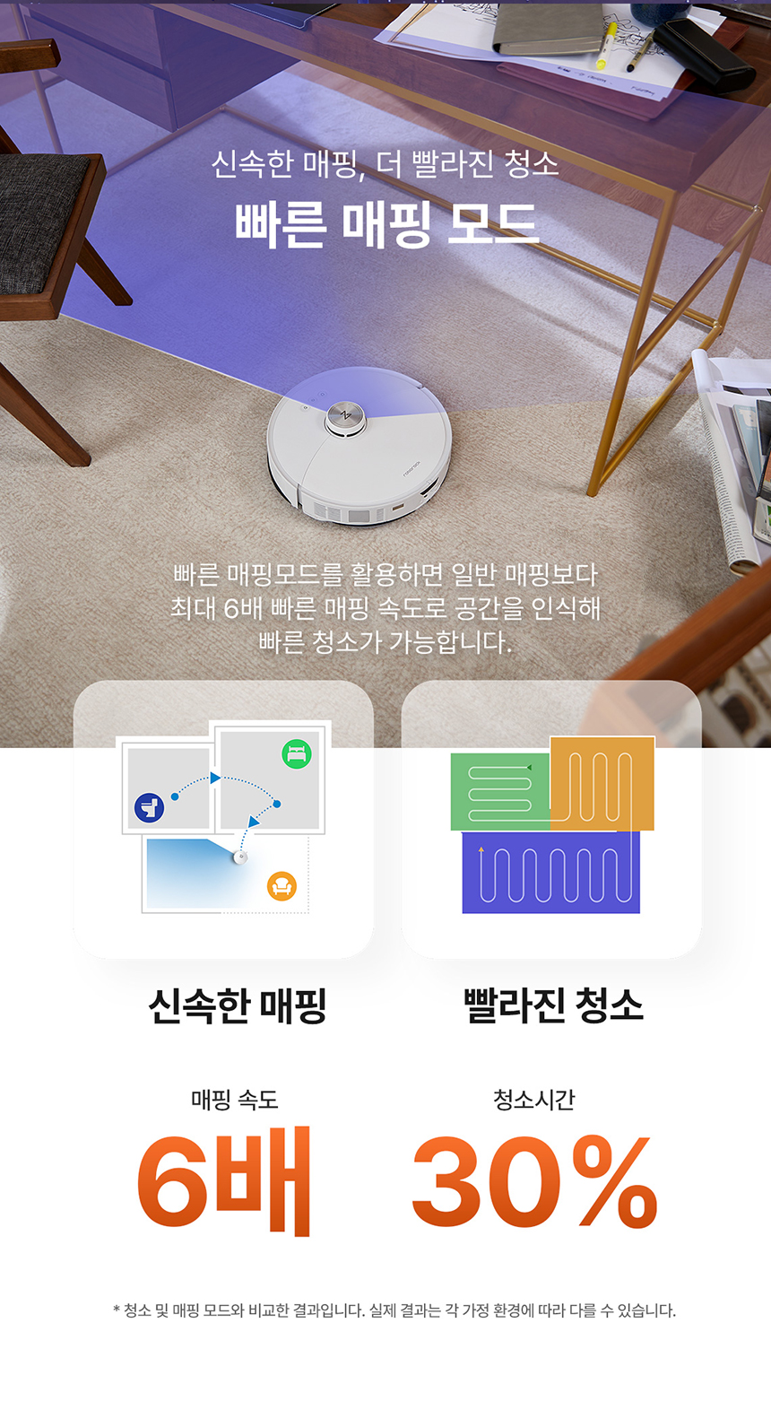 매핑 속도가 기존보다 6배 빨라졌으며, 복잡한 공간도 효율적으로 스캔합니다. 사용자는 앱을 통해 간단히 청소 경로와 모드를 조정할 수 있습니다.