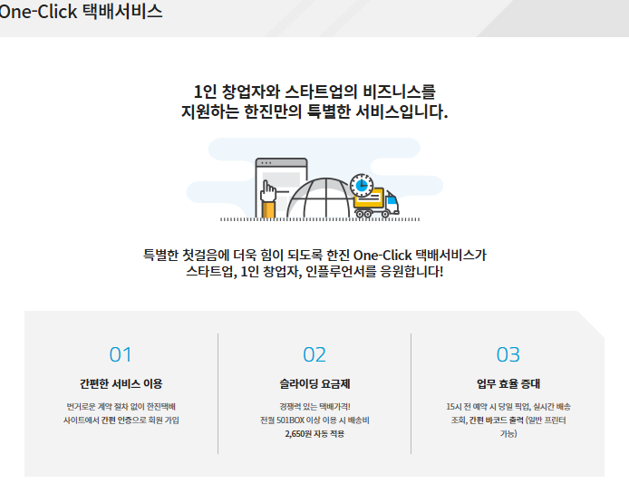 1️⃣ 한진택배 홈페이지 접속 후 "원클릭 택배" 메뉴 선택