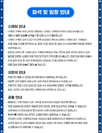 관객이 많은 콘서트인 만큼 경호 및 진행요원들의 지시에 따라 잘 따라주셔야 안전하고 재미난 콘서트를 즐기실 수 있습니다. 도움이 필요하신 경우에는 가까운 진행요원들에게 도움 요청하시면 되겠습니다.