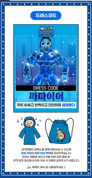 매번 싸이흠뻑쇼를 관람하기 위해 준비물과 드레스코드가 있습니다. 이번 2024 싸이흠뻑쇼의 준비물과 드레스코드는 파란 우비와 파란 비닐백팩은 현장에서 관객분들을 위해 준비한다고 합니다. 시원한 여름을 연상하는 파란색의 드레스코드로 입고 입장하시면 되겠습니다.